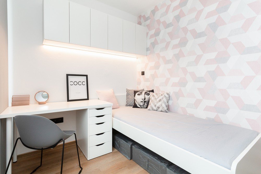 Dla uzyskania wrażenia zwiewności projektanci postawili na proste, jasne meble, które ożywili tapetą w stylu kubistycznym i kolorowymi dodatkami. Przytulności dodają także dekoracyjne poduszki, szaro-różowy dywan czy puf, który Daniela może wykorzystać nie tylko jako miejsce do siedzenia, ale także jako stolik.