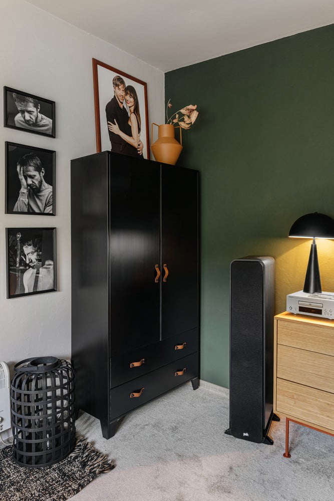 Najwięcej uwagi skupiłam na komodzie na gramofon. Cała ta ściana ma brać pod uwagę dźwięk, a także pomieścić sporą ilość płyt. Jest to też dość duży i charakterystyczny mebel na małej przestrzeni.