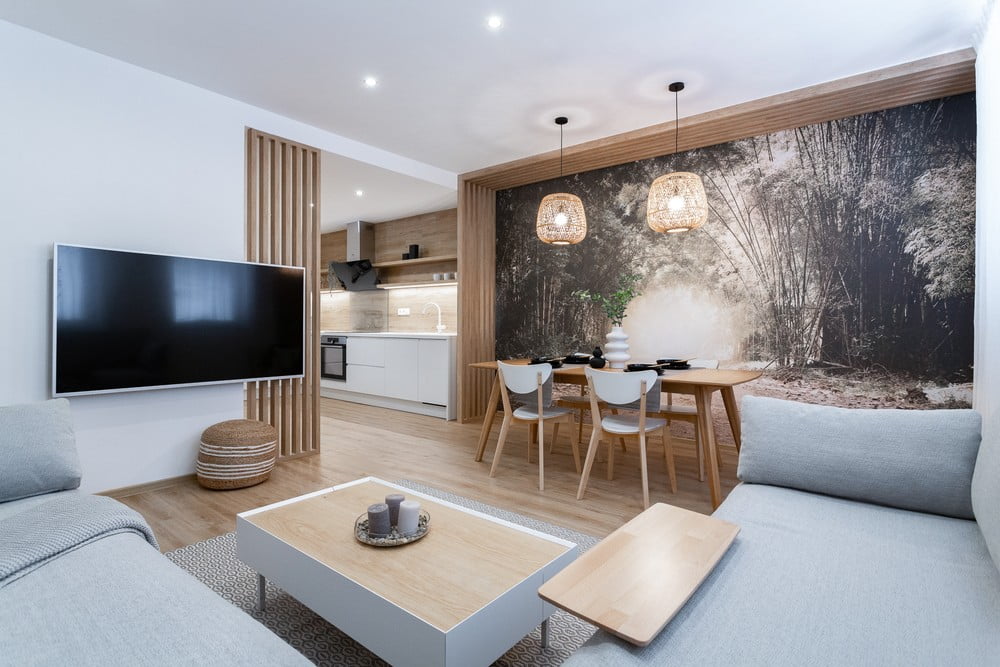 Głównym motywem części dziennej była fototapeta o tematyce przyrodniczej, otoczona drewnianymi lamelami. Projektanci uzupełnili naturalny styl wiklinowymi dekoracjami, oświetleniem i rattanowymi pufami. Kolor zielony przenika więc do całego wnętrza nie tylko dzięki fototapecie, ale także dzięki żywym roślinom.