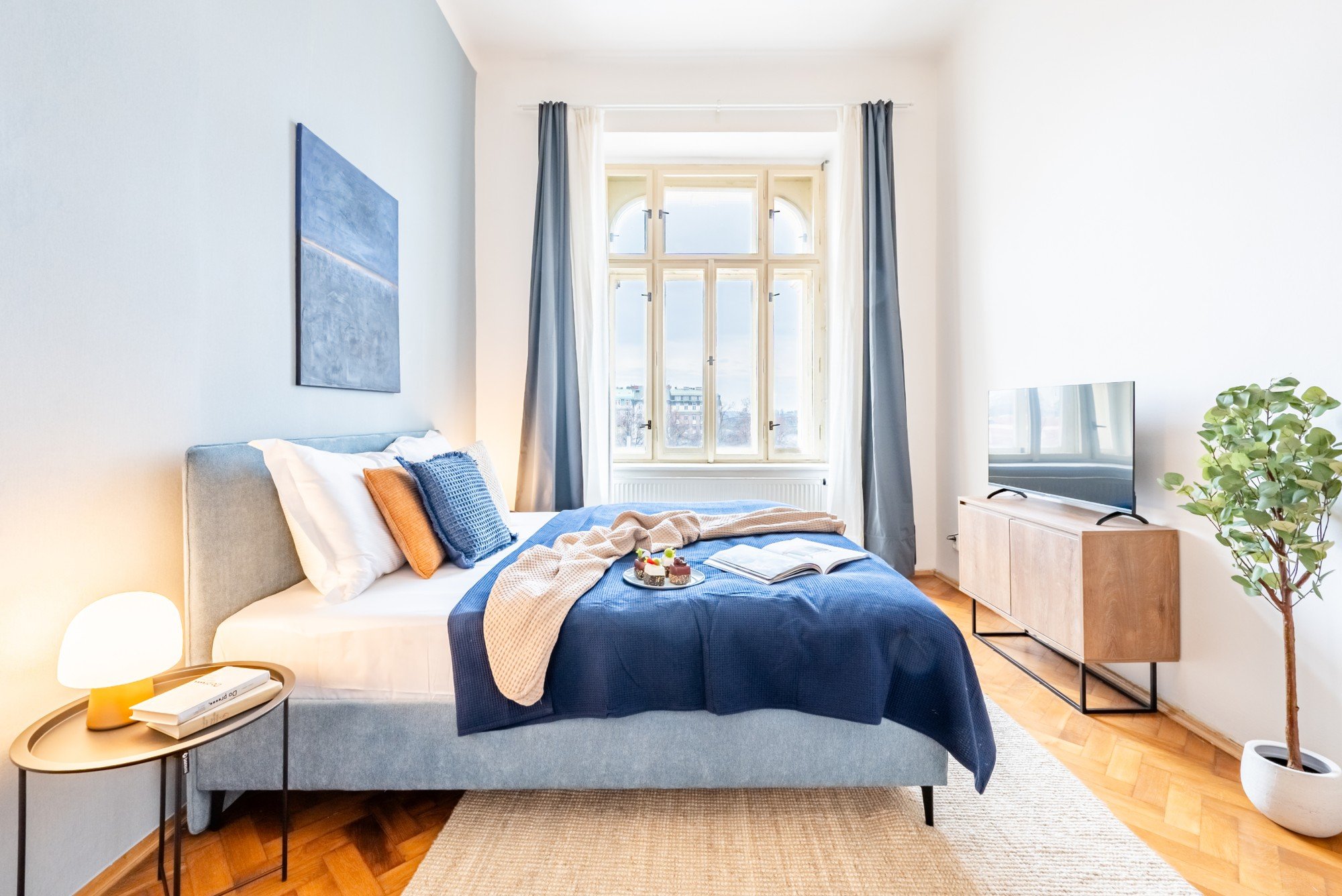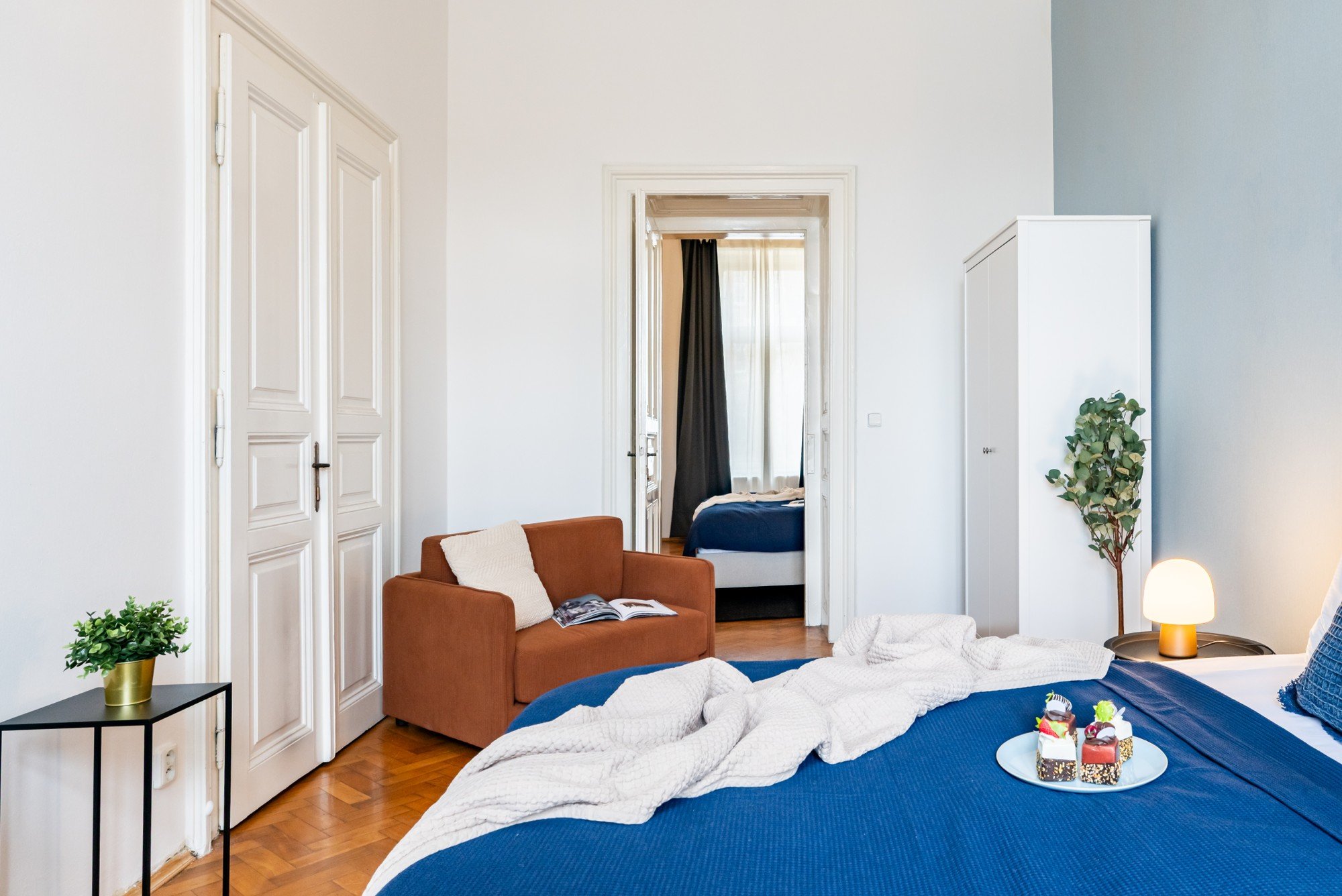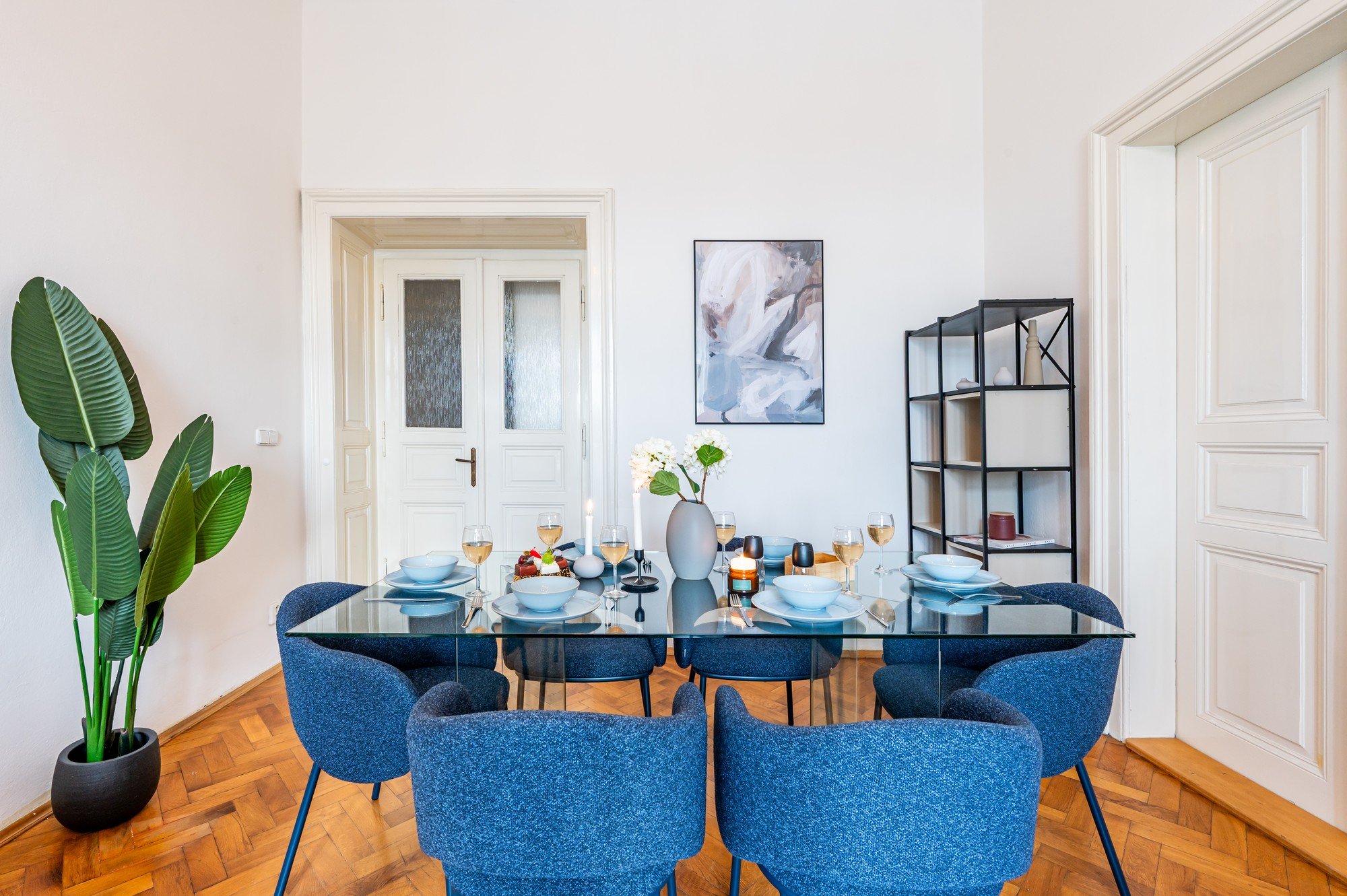 Mieszkanie w zabytkowej kamienicy łączy pokaźny metraż z przemyślanymi detalami. Wysokie sufity, oryginalne parkiety i kontrast ciemnego drewna z delikatnymi odcieniami niebieskiego tworzą ponadczasowe, spokojne, eleganckie i przytulne wnętrze. Układ zaprojektowany został tak, by codzienne mieszkanie było wygodne i udowadnia, że komfort i charakter mogą iść ze sobą w parze.