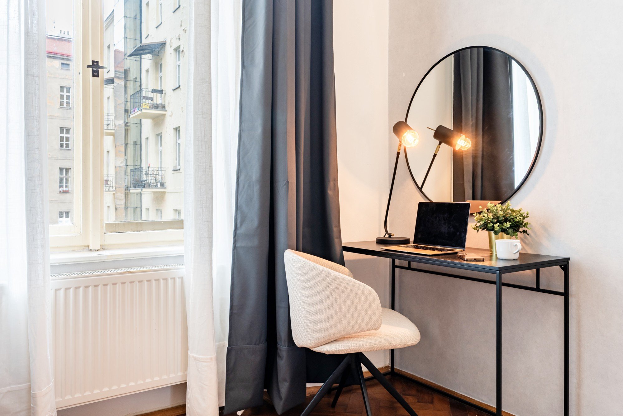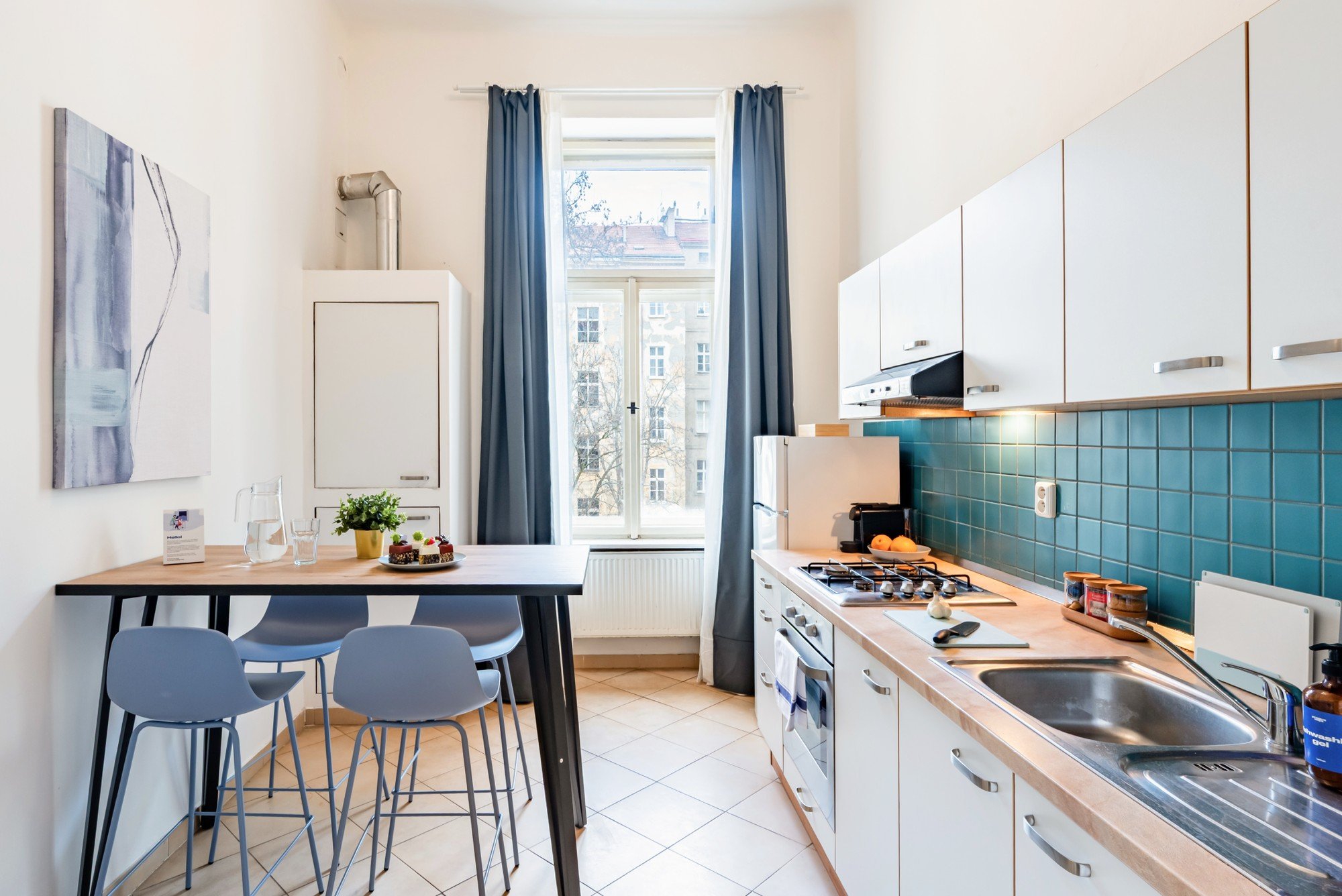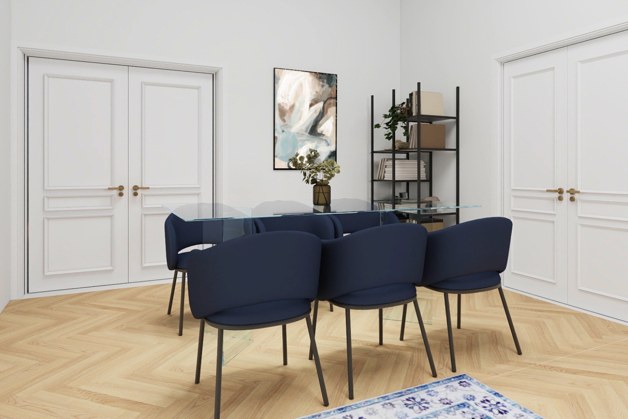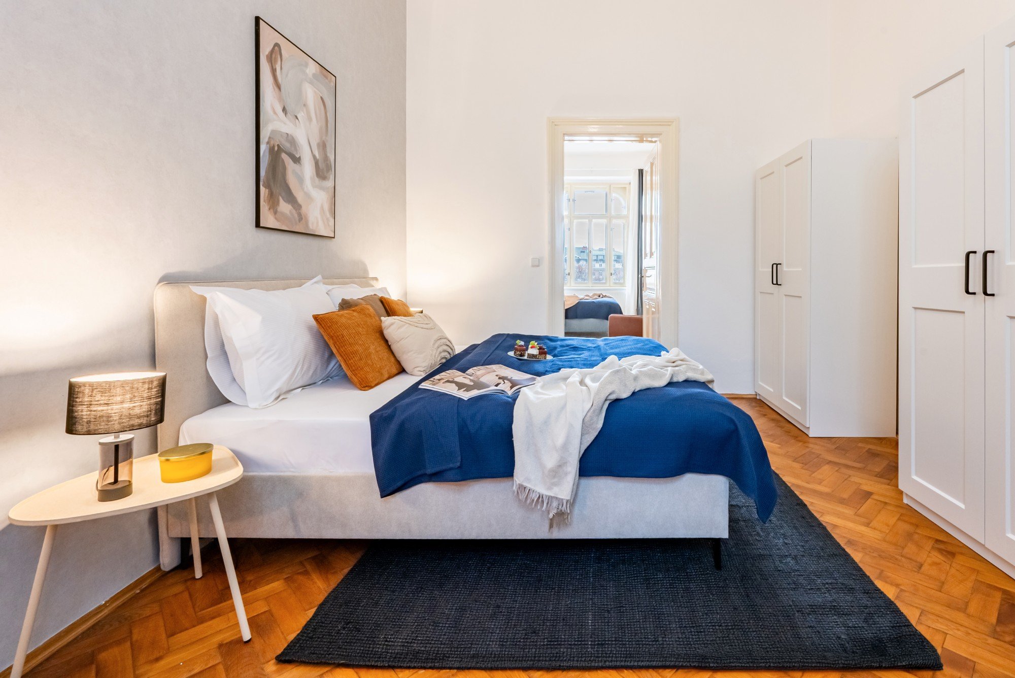 Mieszkanie w zabytkowej kamienicy łączy pokaźny metraż z przemyślanymi detalami. Wysokie sufity, oryginalne parkiety i kontrast ciemnego drewna z delikatnymi odcieniami niebieskiego tworzą ponadczasowe, spokojne, eleganckie i przytulne wnętrze. Układ zaprojektowany został tak, by codzienne mieszkanie było wygodne i udowadnia, że komfort i charakter mogą iść ze sobą w parze.