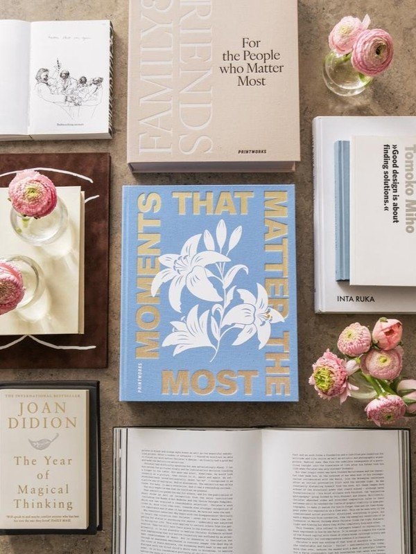 Album The Moments that Matters the Most od Printworks to elegancki album na zdjęcia, który idealnie nadaje się na stolik kawowy. Posiada materiałową okładkę i nowoczesny design.