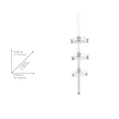 Półka posiada trzy regulowane poziomy, które można przesuwać i są wyposażone we wspornik o owalnym profilu. Jedna z tych półek ma również poręczne haczyki, na których można powiesić gąbkę pod prysznic, myjkę lub inne małe przedmioty. Dzięki teleskopowej konstrukcji wysokość można regulować w zakresie od 188 do 280 cm.