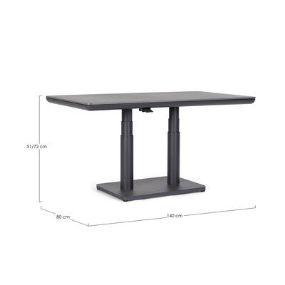 Stół ogrodowy Miguel marki Bizzotto stanie się praktycznym dodatkiem na Twój taras. Jego konstrukcja została wykonana z malowanego proszkowo aluminium, natomiast blat ze spiekanego kamienia o grubości 11 mm. Materiał ten jest naturalnym kamieniem obrabianym w wysokich temperaturach, co zapewnia mu trwałość. Dzięki uchwytowi wysokość stołu można łatwo regulować w zakresie od 51 do 72 cm, co docenisz przy różnych okazjach. Całkowite wymiary stołu wynoszą 140 x 80 cm.