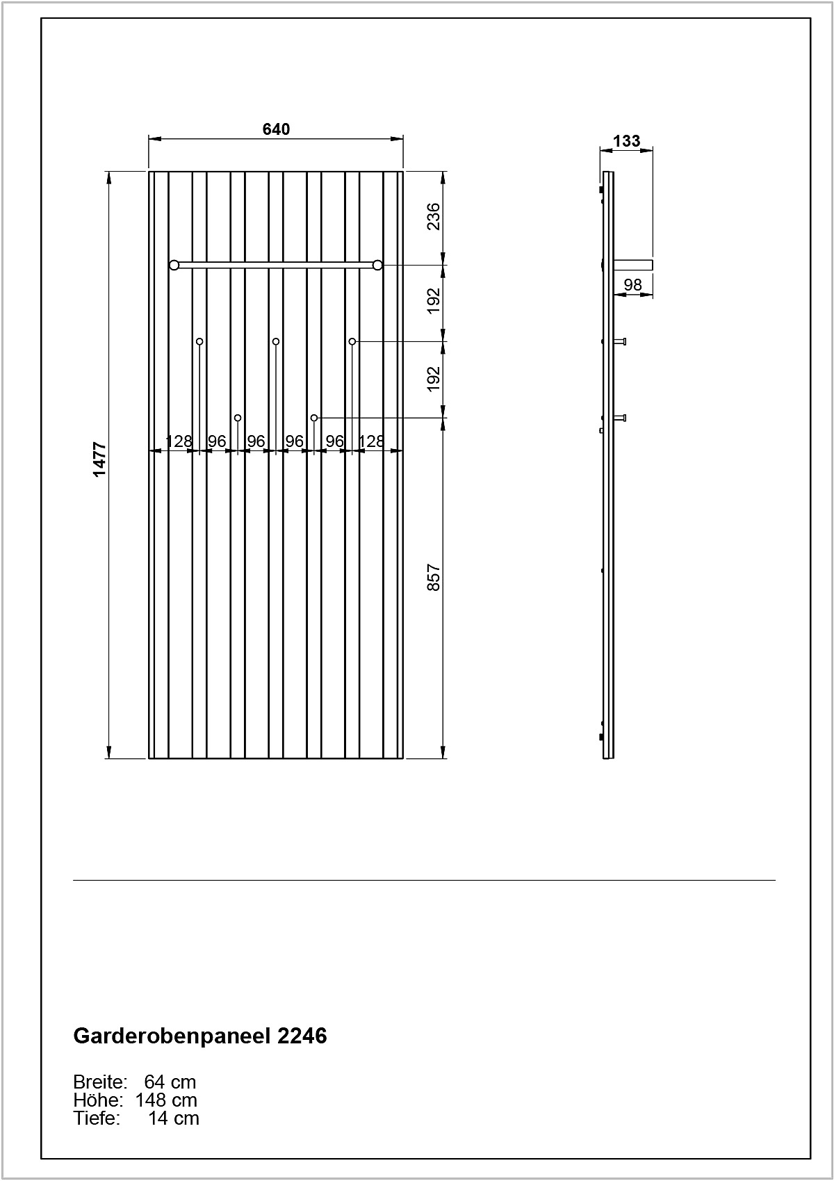 Panel z wieszakami do przedpokoju RenellW dekorze dębu, z płyty wiórowej, powłoka: melamina, antracytowy/w naturalnym kolorze, szerokość 64 cm, wysokość 148 cm, głębokość 14 cm