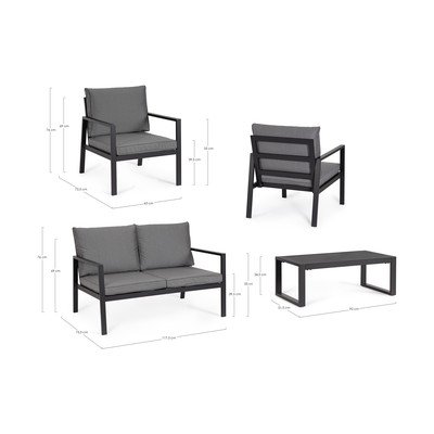 Sofa ma wymiary 117,5 x 73,5 x 76 cm, wysokość siedziska 39,5 cm i wysokość podłokietników 55 cm. Każdy z foteli ma wymiary 63 x 73,5 x 76 cm, wysokość siedziska 39,5 cm i wysokość podłokietnika 55 cm. Stół z blatem z listew ma wymiary 92 x 51,5 x 34,5 cm. Cały zestaw wykonany jest z aluminium, co zapewnia jego lekkość i trwałość.