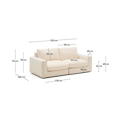 Sofa Alea marki Kave Home, wykonana z przyjemnej w dotyku tkaniny szenilowej, to kwintesencja połączenia stylu i praktyczności. Jej siedziska, wypełnione pianką o gęstości 30 kg/m³ oraz warstwą mikrofibry, zapewniają średnią twardość siedzenia i uczucie, jakbyś unosił się na chmurce.