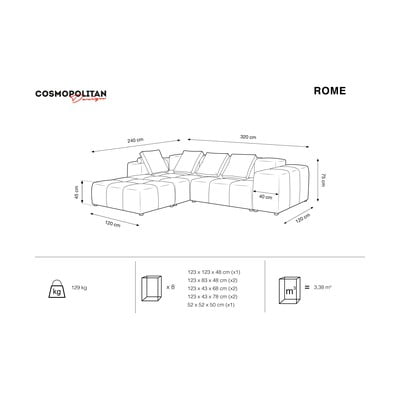 podłokietników, które możesz również kupić osobno, aby stworzyć własny mebel, który będzie pasował zarówno do Twoich potrzeb, jak i do Twojego wnętrza. Z modułów można zbudować mniejszą lub większą sofę, narożnik, a nawet sofę w kształcie litery U. Seria Rome Velvet to także duża różnorodność poduszek w wielu rozmiarach i kolorach, które dodają sofie przytulności i zapewniają wygodę. Powierzchnia poduszek i sofy jest aksamitna. Możesz również wybrać tkaninową wersję sofy