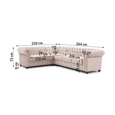 AksamitnyRozkładanyTypu chesterfieldLewostronny/w kształcie litery LBeżowyWodoodporny/plamoodpornyCzteroosobowySzerokość 264 cm