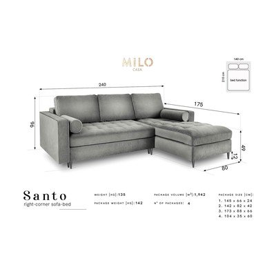 Rozkładany narożnik Santo zapewnia wspaniałą przestrzeń do relaksu dla całej rodziny i dodaje wnętrzu odrobinę luksusu. Tkaniny używane przez markę Milo Casa poddawane są rygorystycznym testom, aby zagwarantować najwyższą trwałość, komfort i atrakcyjny design.