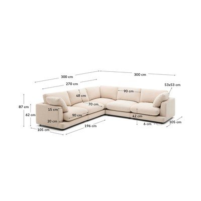 Narożnik Gala marki Kave Home to idealne połączenie designu, komfortu i wysokiej jakości wykonania. Jego zaokrąglone kształty i obszerne wymiary tworzą przytulną atmosferę, idealną do spędzania wyjątkowych chwil z rodziną lub przyjaciółmi.