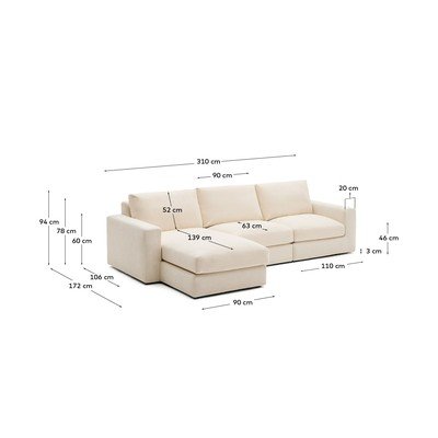 Z tkaniny szenilowejLewostronny/z szezlongiemZe zdejmowanym pokrowcemBeżowyCzteroosobowySzerokość 310 cmGłębokość 172 cmGłębokość siedziska 63 cm