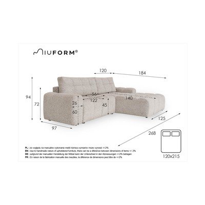 Rozkładany/ze schowkiemPrawostronnyBeżowyTrzyosobowySzerokość 268 cmGłębokość 184 cmGłębokość siedziska 56 cm