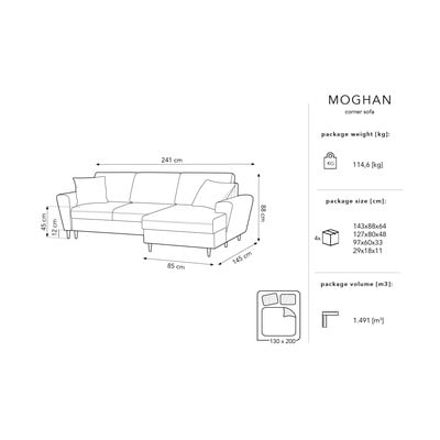 Narożnik Moghan marki Micadoni Home zachwyci Cię swoim delikatnym pięknem w skandynawskim stylu. Powierzchnia to matowa tkanina ze strukturą i wąskimi prążkami o szerokości 3 mm. Dzięki hydrofobowemu pokrowcowi do środka kanapy nic nie przesiąknie. Materiał jest także niezwykle odporny na otarcia i posiada certyfikat Oeko-Tex, który gwarantuje, że jest on bezpieczny dla zdrowia, nie zawiera szkodliwych substancji chemicznych oraz minimalizuje wpływ produkcji na środowisko.