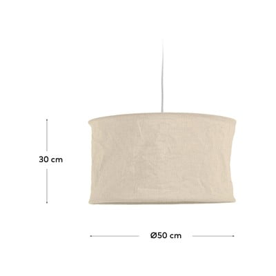 Beżowy abażur Mariela marki Kave Home jest wykonany z lnu i ma wewnętrzną metalową konstrukcję. Do montażu należy dokupić kabel wiszący, na przykład z kolekcji Fulvia i Kaede.