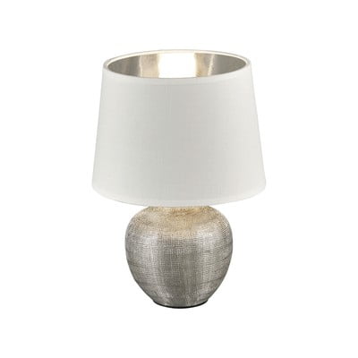 Z tekstylnym kloszemTekstylna/ceramicznaDo kontaktuBiała/w kolorze srebraWysokość 26 cm