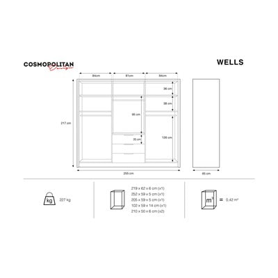Z płyty MDFPowłoka: laminowanieBiałaSzerokość 255 cmWysokość 217 cmGłębokość 65 cm