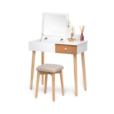 Łatwy montaż, stolik prezentuje się dobrze, tylko lustro jest nisko i muszę się schylać, żeby dobrze widzieć.