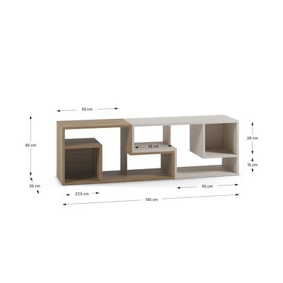 NarożnaW dekorze dębuZ płyty wiórowejPowłoka: melaminaBiała/w naturalnym kolorzeSzerokość 145 cmWysokość 45 cmGłębokość 35 cm