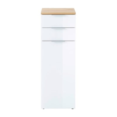Szafka łazienkowa PescaraWysoka/wąska, w dekorze dębu, z płyty wiórowej, powłoka: melamina, z połyskiem, biała/w naturalnym kolorze, szerokość 39 cm, wysokość 112 cm, głębokość 34 cm