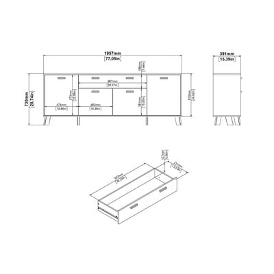 Komoda o wymiarach 196x73x39 cm oferuje mnóstwo miejsca do przechowywania w trzech zamkniętych modułach z regulowanymi półkami i szufladą. Połączenie bieli i naturalnego dębu tworzy nowoczesny i czysty wygląd, który pasuje do różnych wnętrz. Prosty design z minimalistycznymi uchwytami podkreśla współczesny styl.