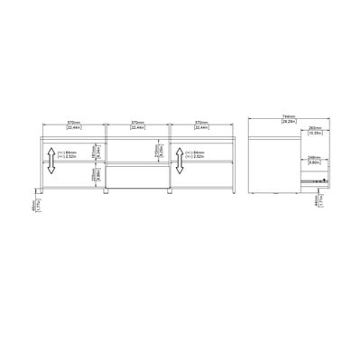 Biały kolor w połączeniu z dębowym dekorem tworzy elegancki wygląd. Wymiary 179x52x48 cm zapewniają dużo miejsca na telewizor i inny sprzęt. Regulowane półki i zintegrowany system na kable zapewniają maksymalną funkcjonalność.