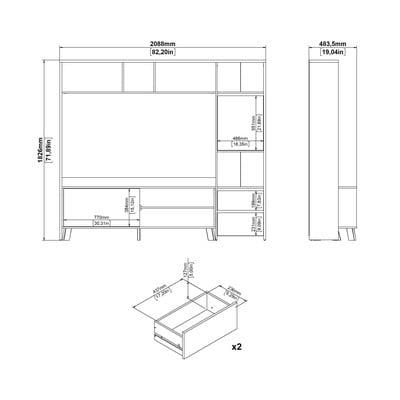 Szadka pod TV Next marki Tvilum łączy skandynawski styl z praktycznością. Szafka o wymiarach 209x183x48 cm oferuje eleganckie rozwiązanie do salonu. Zestaw zawiera otwarte półki z przegrodami, ukryty schowek, dolną otwartą sekcję z przesuwanymi drzwiami i dwie przestronne szuflady. Idealny do uporządkowania multimediów i elektroniki, nadając przestrzeni nowoczesny wygląd.