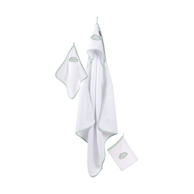 Zestaw ręczników Happy Cloud marki Roba jest idealny do pielęgnacji niemowląt. Zestaw zawiera ręcznik z kapturem (80 x 80 cm), mały ręcznik (30 x 30 cm) i myjkę (16 x 20 cm).
