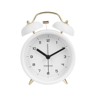 Klasyczny kształt budzika, cichy mechanizm, kolor ciepła biel.