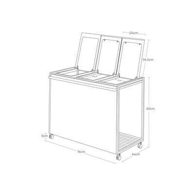 Trzyczęściowy kosz jest praktycznym pomocnikiem w sortowaniu odpadów. Jest wyposażony w kółka z uchwytami do łatwego przemieszczania. Metalowa konstrukcja ma plastikowe pokrywy na zawiasach z ramą do zawieszania trzech worków i przednią pełną sekcję, która zakrywa śmieci. Dolną półkę można wykorzystać do przechowywania zapasowych worków i mieć je zawsze pod ręką.
