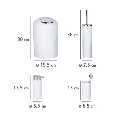 W zestawie znajdziesz kubek na szczoteczkę do zębów, dozownik mydła z pompką, kosz na śmieci o pojemności 6,5 litra z praktyczną klapką ułatwiającą opróżnianie, a także zestaw WC ze szczotką i wymienną końcówką o szerokości 6,5 cm. Szczotka ma elastyczne włosie z tworzywa sztucznego, które skutecznie czyści i nie rysuje muszli klozetowej.