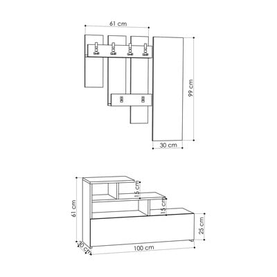 Zestaw do przedpokoju składa się z szafki na buty (100 x 61 x 30 cm), lustra (30 x 99 cm) i wieszaka ściennego o szerokości 61 cm.