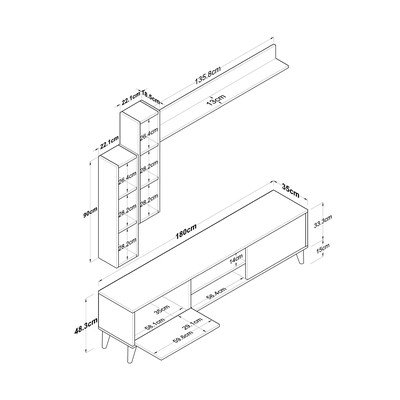 W dekorze orzecha, z płyty MDF, powłoka: melamina, biały/w naturalnym kolorze, szerokość 180 cm, wysokość 48 cm, głębokość 35 cm