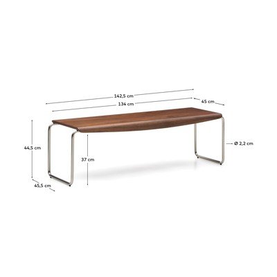 Brązowa ławka Tarsel marki Kave Home to elegancki i praktyczny dodatek do Twojego wnętrza. Jej blat wykonano z giętego drewna, pokrytego fornirem orzechowym o grubości 0,6 mm. Dzięki obróbce prasą membranową i lakierem poliuretanowym, powierzchnia jest bardziej odporna i posłuży Ci przez długi czas.
