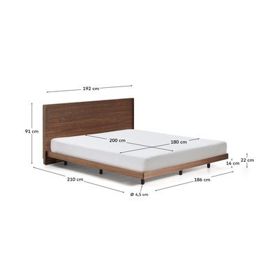 Łóżko dwuosobowe Norlen marki Kave Home oddaje hołd wzornictwu lat 50. z nowoczesnym akcentem, łącząc minimalistyczne kształty i detale w stylu vintage. Delikatnie zaokrąglone rogi oraz drewniana podstawa przywołują nostalgiczną atmosferę, która jest reinterpretowana przez czyste linie i współczesne proporcje. Zagłówek, wykonany z forniru z rysunkiem drewna i subtelnym poziomym frezowaniem, dodaje łóżku charakteru i wizualnej głębi. Zintegrowany pasek LED w górnej części zagłówka oświetla pomieszczenie ciepłym i przyjemnym światłem o intensywności 3000K, idealnym do stworzenia przytulnej atmosfery do odpoczynku. Światło zagłówka aktywowane jest pilotem, a kabel zasilający o długości 1,5 metra ułatwia wygodną i wszechstronną instalację.