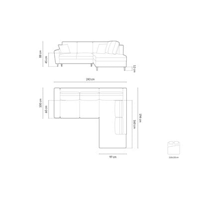 Aksamitny, rozkładany/ze schowkiem, prawostronny/w kształcie litery L, ciemnoszary, czteroosobowy, szerokość 243 cm