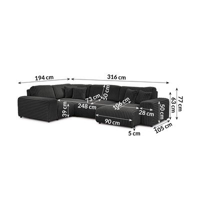 Sztruksowy, lewostronny/w kształcie litery U, ciemnoszary, wodoodporny/plamoodporny, czteroosobowy, szerokość 316 cm