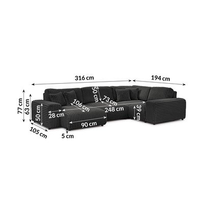 Sztruksowy, prawostronny/w kształcie litery U, ciemnoszary, wodoodporny/plamoodporny, czteroosobowy, szerokość 316 cm