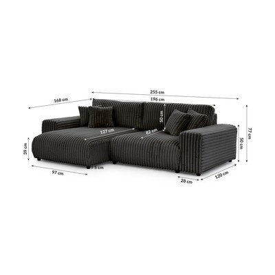 Sztruksowy, rozkładany/ze schowkiem, lewostronny, ciemnoszary, wodoodporny/plamoodporny, trzyosobowy, szerokość 255 cm