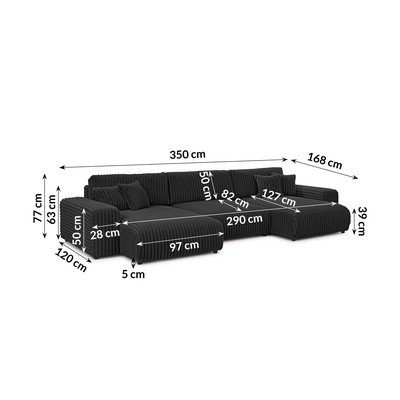Sztruksowy, rozkładany/ze schowkiem, w kształcie litery U, ciemnoszary, wodoodporny/plamoodporny, powyżej 4 osób, szerokość 350 cm