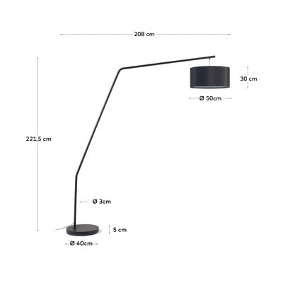 Lampa podłogowa Ciana marki Kave Home wykonana jest z metalu z czarnym wykończeniem. Lampa ma prosty, nowoczesny design z długim ramieniem i okrągłym kloszem z tkaniny. Jeśli z czasem zapragniesz zmiany, klosz można łatwo wymienić na inny. Lampa jest kompatybilna z żarówkami E27 o maksymalnej mocy 32 W.