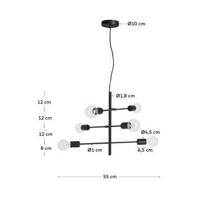 Czarna lampa wisząca Spica o średnicy 55 cm marki Kave Home zachwyca nowoczesnym designem, który zdominuje Twój salon. Oprawa wykonana jest z metalu, a jej unikalny styl pozwala sześciu żarówkom wyróżnić się i stać się integralną częścią całego projektu.
