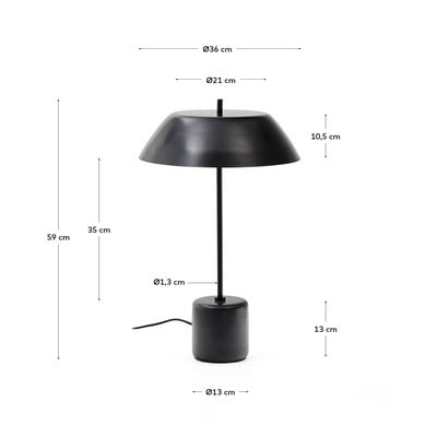 Lampa stołowa Sayra marki Kave Home wniesie minimalistyczną elegancję do Twojego wnętrza. Lampa składa się z czarnego metalowego klosza, który znajduje się na smukłym pręcie. Stabilność lampy zapewnia okrągła podstawa z czarnego marmuru, która sprawia, że każdy egzemplarz jest oryginalny z unikalnym wzorem i fakturą.