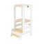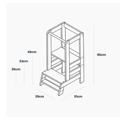 Konstrukcja jest stabilna i wykonana z drewna, co zapewnia bezpieczeństwo. Wysokość platformy można łatwo regulować bez użycia narzędzi, w trzech wariantach: 20 cm, 33 cm i 46 cm od podłogi, co pozwala dostosować się do wzrostu dziecka i promuje jego niezależność.