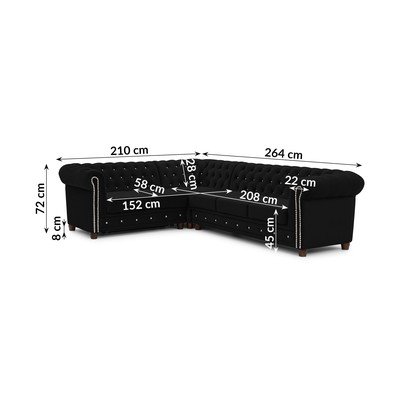 AksamitnyRozkładanyTypu chesterfieldLewostronny/w kształcie litery LCzarnyWodoodporny/plamoodpornyCzteroosobowySzerokość 264 cm