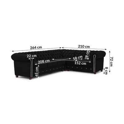 AksamitnyRozkładanyTypu chesterfieldPrawostronny/w kształcie litery LCzarnyWodoodporny/plamoodpornyCzteroosobowySzerokość 264 cm