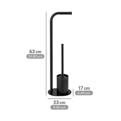 Stalowy dodatek elegancko łączy w sobie uchwyt na papier toaletowy ze szczotką do WC. Szczotka jest umieszczona w oddzielnym pojemniku u podstawy stojaka, a jej końcówka ma średnicę 7,5 cm.