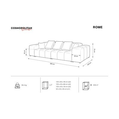 Odkryj połączenie funkcjonalności oraz elegancji i wybierz spośród wielu opcji kolorystycznych sofy Rome Velvet. Sofa składa się z kilku prostokątnychkwadratowych modułów, oparć oraz podłokietników, które możesz również kupić osobno, aby stworzyć własny mebel, który będzie pasował zarówno do Twoich potrzeb, jak i do Twojego wnętrza. Z modułów można zbudować mniejszą lub większą sofę, narożnik, a nawet sofę w kształcie litery U. Seria Rome Velvet to także duża różnorodność poduszek w wielu rozmiarach i kolorach, które dodają sofie przytulności i zapewniają wygodę. Powierzchnia poduszek i sofy jest aksamitna. Możesz również wybrać tkaninową wersję sofy Rome.