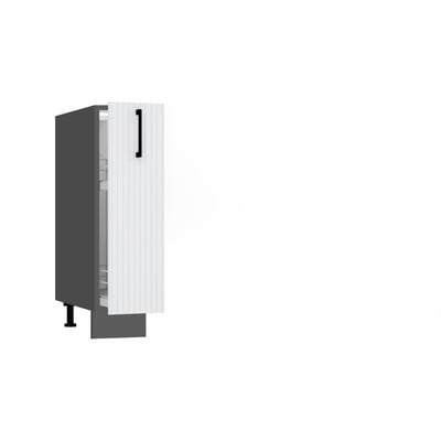 Dolna szafka kuchenna Rowan łączy kontrastujące odcienie ciemnej szarości i bieli. Za drzwiczkami pokrytymi melaminową folią o grubości 16 cm znajdują się dwa kosze cargo nadające się na przykład do przechowywania butelek. Dzięki zawiasom z systemem Soft Closing szafka zamyka się cicho i płynnie, bez stukania. Korpus szafki jest wykonany z białej płyty laminowanej o grubości 16 mm.