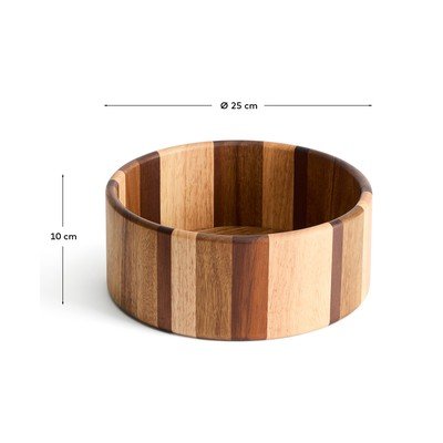 Miska została zaprojektowana tak, aby pełniła zarówno funkcję praktyczną, jak i dekoracyjną. Jej efektowny, paskowany wzór z różnych rodzajów drewna sprawia, że świetnie pasuje zarówno do kuchni, jak i jadalni, służąc do podawania potraw lub jako stylowa ozdoba.